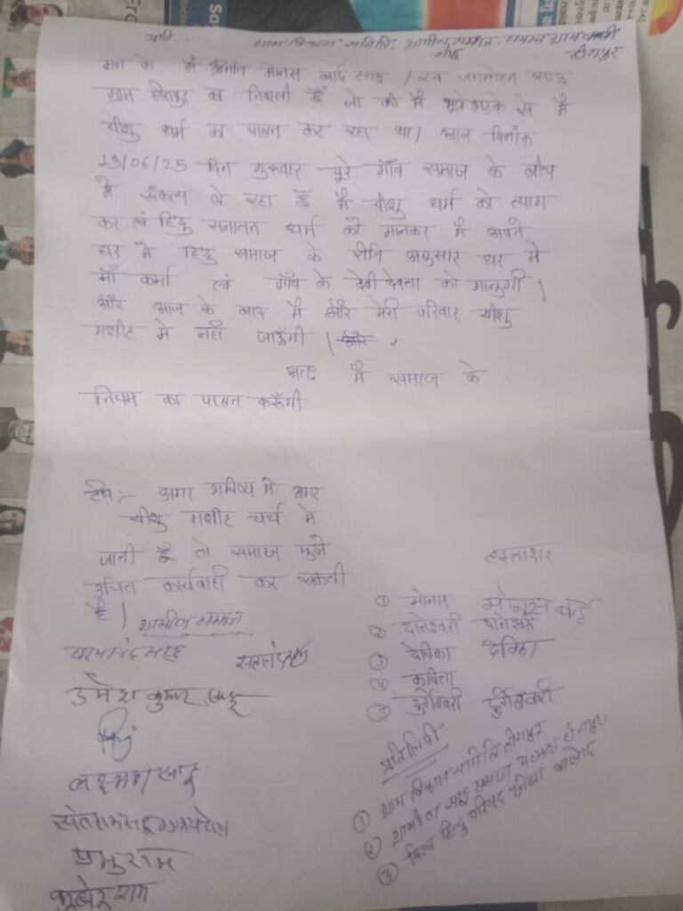 वही लिखित पत्र में कहा कि हम सनातन हिंदू धर्म की परंपरा व रीति रिवाजों,पूजा पद्धति के अनुसार रहेंगे व घर मे हिंदू देवी देवता की स्थापना करेंगे तब गांव वाले की सहमति से अंतिम संस्कार के लिए जगह दी गई। मृतक परिवार की मोनस बाई साहू पति स्वर्गीय जगमोहन साहू, दानेश्वरी साहू,देविका साहू, कविता साहू, दुर्गेश्वरी साहू ने गांव के मंदिर में जाकर पूजा की,ईसाई धर्मग्रंथ बाइबिल को नदी में विसर्जित किया व हिंदू धर्म के पवित्र गंगाजल को पीकर हिंदू धर्म को वापस अपनाया व पूजा की। ज्ञात हो कि बालोद जिला में गुरुर ब्लॉक सनौद के बाद अब बालोद ब्लॉक के हीरापुर में धर्मांतरित ईसाई की मौत पर ग्रामीणों ने अंतिम संस्कार के लिए जगह देने से मना किया है। सनौद में स्थानीय प्रशासन व पुलिस की मौजूदगी में गांव वालों के भारी विरोध के बाद धर्मांतरित मृतक के शव को दूसरे जिले धमतरी में भेजा गया तब मामला शांत हुआ था। विश्व हिंदू परिषद से जुड़े संगठन के बड़े नेता जिले के अंदर ईसाई मिशनरियों के द्वारा चलाये जा रहे हिंदू विरोधी कार्यो को रोकने लगातार अभियान चलाकर गांवों में जागरण का काम कर रहे है। विहिप के माध्यम से बालोद शहर,गुंडरदेही,डौंडी,डौंडीलोहारा,गुरुर,अर्जुन्दा ब्लाक के कई गांव में अवैध प्रार्थना सभाओं पर रोक भी लगवाया था। वही पुलिस ने कुछ लोगो को गिरफ्तार कर जेल भी भेजा था। ताजा मामले पर ग्राम हीरापुर में सेतराम साहू ग्राम पटेल,परमानंद साहू,सतानंद साहू,लक्ष्मण साहू,प्रभुराम,कुबेर सहित विश्व हिंदू परिषद के उमेश सेन,व बालोद ग्रामीण विहिप अध्यक्ष मुरली साहू सहित बड़ी संख्या में ग्रामीण उपस्थित थे।