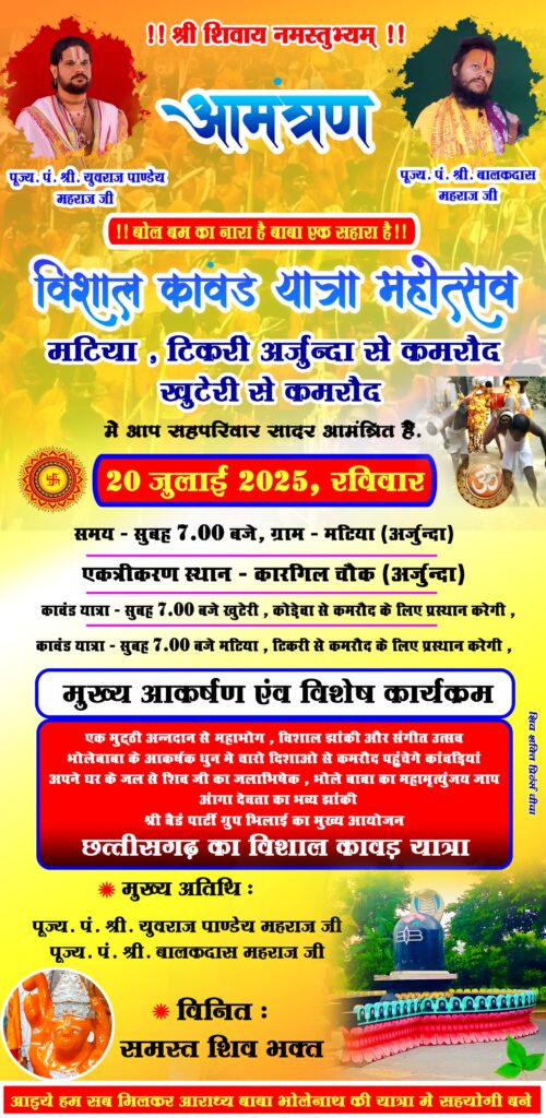 संतोष साहू,बालोद| छत्तीसगढ़ प्रदेश ग्रामीण अंचल का विशाल कांवड़ यात्रा का आयोजन 20 जुलाई रविवार को होगा।आयोजन समिति के अंजु संदीप साहू , पंकज चौधरी, वामन साहू ने बताया कि आचार्य पंडित युवराज पांडे और पाटेश्वर धाम के संत बालक दास सहित हजारों महिलाएं हजारों की संख्या में शिव भक्त कावड़ यात्रा में शामिल होंगे। कावड़ यात्रा तीन रास्तों से होकर कमरौद मंदिर पहुंचेगी। ग्राम अरौद , लाटाबोड़ , देवी नवागांव , सुंदरा , जगन्नाथपुर , सांकरा से कमरौद तक मटिया ( अर्जुंदा) से कमरौद बोल बम के जयकारे के गूंज के साथ शिवलिंग पर जलाभिषेक कर महामृत्युंजय जाप और महाभोग संगीत महाउत्सव होगा। कावड़ यात्रा आयोजन समिति के संदीप साहू ( अरौद ) प्रेम साहू ( घुमका ) दानेश्वर मिश्र ( पोंडी ) कुलदीप यादव ( बिरेतरा ) ने बताया कि यह यात्रा लगभग 17 किलोमीटर का होगा। इस दौरान भगवान भोलेनाथ के भजन के साथ आचार्य पंडित युवराज पांडे की यात्रा और शिव भगवान पर आधारित चलित झाकियां व आकर्षक डीजे ढोलतासा से आकर्षण का केंद्र रहेगा इसके साथ ही कावड़ यात्रियों पर गांव-गांव में फूलों का वर्षा की जाएगी। कावड़ यात्रा में सुप्रसिद्ध भजन का भी आयोजन किया जाएगा।