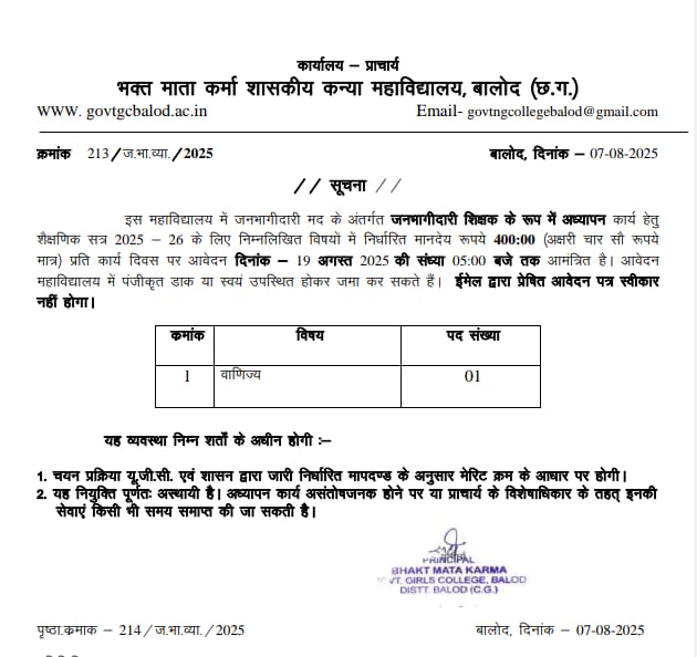 बालोद। कन्या कॉलेज बालोद में जनभागीदारी मद के अंतर्गत जनभागीदारी शिक्षक (अतिथि व्याख्याता) के रूप में अध्यापन कार्य हेतु शैक्षणिक सत्र 2025-26 के लिए एक विषय में निर्धारित मानदेय 400 रुपए प्रति कार्य दिवस पर भर्ती होगी।इसके लिए आवेदन 19 अगस्त 2025 की संध्या 5:00 बजे तक आमंत्रित है। आवेदन महाविद्यालय में पंजीकृत डाक या स्वयं उपस्थित होकर जमा कर सकते हैं। ईमेल द्वारा प्रेषित आवेदन पत्र स्वीकार नहीं होगा।