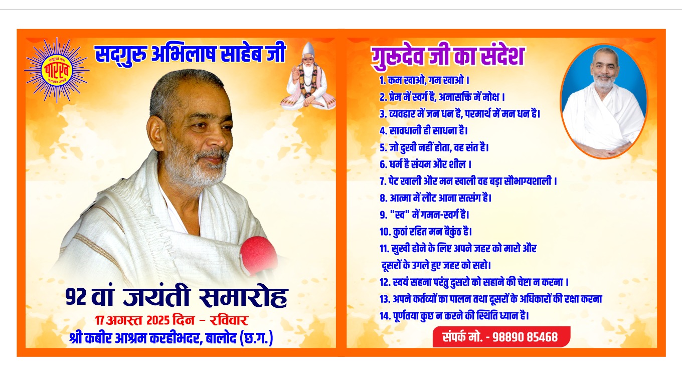 श्री कबीर आश्रम करहीभदर में 17 अगस्त को मनाई जाएगी सद्गुरु अभिलाष साहेब की जयंती Posted on August 12, 2025 | Posted on Madhuri Yadav बालोद। श्री कबीर आश्रम करहीभदर में 17 अगस्त रविवार को सद्गुरु अभिलाष साहेब जी की जयंती समारोह का आयोजन किया जाएगा। उक्त जानकारी देवेंद्र साहेब ने दी। Post Views: 128