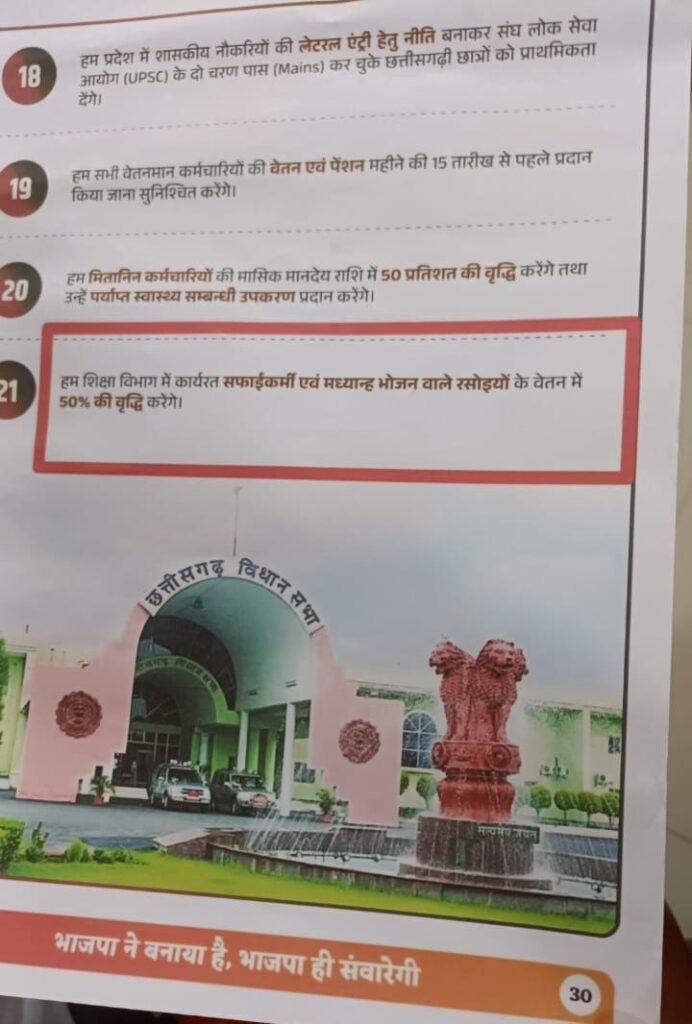 मोदी की गारंटी के तहत चुनावी घोषणा पत्र में 50% वेतन में वृद्धि तत्काल किया जाए। पूरे 12 महीना का वेतन दिया जाए। युक्तियुक्तकरण के तहत मर्ज हुए शालाओं में कर्मचारियों को यथावत रखा जाए।