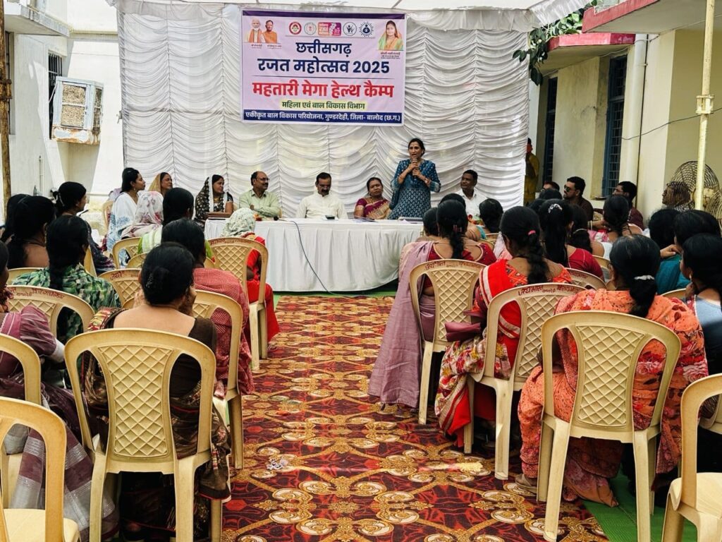 बालोद/गुण्डरदेही। एकीकृत बाल विकास परियोजना गुण्डरदेही, जिला बालोद (छ. ग.) के तत्वाधान में “छत्तीसगढ़ रजत महोत्सव 2025 महतारी मेगा हेल्थ कैंप” का आयोजन में गुंडरदेही विधानसभा के विधायक श्री कुवंर सिंह निषाद व श्रीमती दंतेश्वरी निषाद मुख्य अतिथि के रूप में सम्मिलित हुए। महतारी मेगा हेल्थ कैंप में विकास खंड गुण्डरदेही के विभिन्न ग्रामों से आए हुए महिलाओं का स्वास्थ्य जांच किया गया। जिसमें महिलाओं का बीपी, शुगर, हीमोग्लोबिन,नेत्र एवं दंत जांच एवं स्वास्थ्य जांच कर दवाइयों का वितरण किया गया। विशेष आवश्यकता वाले महिलाओं का एक्सरा, सोनोग्राफी भी करवाया गया। बुजुर्ग महिलाओं को उनके आवश्यकता अनुसार विटामिन का सिरप, आयरन, कैल्शिया का दवाई भी दिया गया। इस दौरान विधायक द्वारा संबोधित करते हुए कहा कि सभी माताएं बहने अपने स्वास्थ का बेहतर ध्यान रखे। स्वस्थ महिला अपने परिवार को स्वस्थ रखने और पालन पोषण का काम करती है अपने स्वास्थ्य के प्रति सजग रहे।