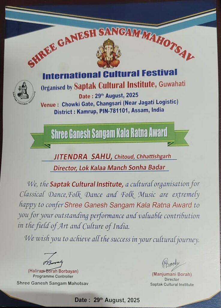 गुरूर।सप्तक इंटरनेशनल द्वारा आयोजित,श्री गणेश संगम महोत्सव,इंटरनेशनल कल्चरल फेस्टिवल 2025, जहां पर 27 से 30 अगस्त तक देश विदेश से कलाकारो की प्रस्तुति हुई l गुवाहाटी असम के सुप्रसिद्ध फोक एवं क्लासिकल टीचर इंटरनेशनल कलाकार श्रीमती मोंजू हालीराम बोरह के दिशा निर्देशन मे दिनांक 29 अगस्त को छत्तीसगढ़ के सुप्रसिद्ध लोक सांस्कृतिक संस्था सोनहा बादर चिटौद (गुरुर ) जिला बालोद छत्तीसगढ़ का झमाझम प्रदर्शन हुआ। साथ ही श्रीलंका से दुमीथा गुणवर्धना,मुंबई से क्षमा कुलकर्णी,महाराष्ट्र से बालासाहेब नारारे, महाराष्ट्र से सुयोग डांस ग्रुप एवं असम से बीहू डांस ग्रुप की प्रस्तुति किया गया।l ऐसे ही अलग अलग दिन भारत के अलग अलग राज्यों से व विदेशो के कलाकारों की प्रस्तुति हुई। सोनहा बादर के संचालक, निर्देशक, गीतकार, संगीतकार जितेन्द्र साहू ने आयोजक समिति दर्शकों व छत्तीसगढ़ का नमन आभार व्यक्त करते हुए बताया कि इस बार भी हमारे लिए सुनहरा अवसर रहा। गुवाहाटी असम के विशाल व ऐतिहासिक मंच पर प्रदर्शन करने का सौभाग्य हमें मिला। सभी कलाकारों ने पूरे जोश व मर्यादित होकर सफल व नैनाभिराम प्रदर्शन करने में कामयाब रहे । हमारी हरेक प्रस्तुति में तालियों की बौछार होती रही। भगवान कृपा,माता पिता,गुरुजन वरिष्ठ जन व छत्तीसगढ़ महतारी के आशीर्वाद दया दृष्टि से निरंतर हमें भारत के अलग अलग राज्यों व विदेश में छत्तीसगढ़ की कला, संस्कृति, परम्परा को गीत संगीत के माध्यम से प्रदर्शित करने का सौभाग्य मिलता आ रहा है।