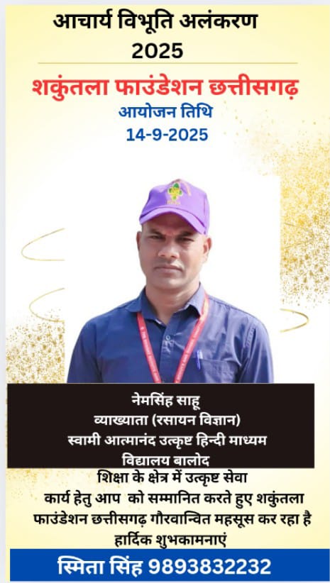 बालोद – शकुंतला फाउंडेशन रायपुर छत्तीसगढ़ द्वारा आयोजित शिक्षक सम्मान समारोह में आत्मानन्द बालोद के व्याख्याता नेमसिंह साहू को राज्यपाल शिक्षक पुरस्कार 2026 के लिए चयनित होने, शिक्षा के क्षेत्र में उत्कृष्ट कार्य करने, निस्वार्थ सेवा, समर्पण, करुणा एवं उत्कृष्ट योगदान हेतु आचार्य विभूति अलंकरण सम्मान 2025 दिया है। शकुंतला फाउंडेशन रायपुर द्वारा विगत दिनों आचार्य विभूति अलंकरण समारोह का आयोजन स्थान बापू की कुटिया कलेक्ट्रेट परिसर रायपुर में किया गया । जिसमें शिक्षा के क्षेत्र में उत्कृष्ट कार्य करने वाले शिक्षकों को सम्मानित किया गया। शकुंतला फाउंडेशन जो कि एक बहुत ही प्रसिद्ध संस्था है, यह समाज सेवा की क्षेत्र में विभिन्न कार्य कर रही है। इस संस्था की संस्थापिका स्मिता सिंह है। कार्यक्रम में मुख्य अतिथि श्रीमती अरुणा पलटा पूर्व कुलपति व शिक्षाविद, विशेष अतिथि मुकेश शाह , शुभा शुक्ला वरिष्ठ समाजसेवी व कवियत्री, कविता कुंभज जी पारस ग्रुप ऑफ इंस्टीट्यूट थे। शकुंतला फाउंडेशन रायपुर सर्वजन हिताय सर्वजन सुखाय के उद्देश्य को लेकर समाज सेवा और जनकल्याण के लिए कार्य कर रही है। नेमसिंह साहू को सम्मानित किए जाने पर स्काउट्स गाइड्स जिला बालोद के जिला मुख्य आयुक्त जनसेवक श्री राकेश यादव , जिला शिक्षा अधिकारी बालोद वाई डी साहू , शाला के प्राचार्य अरुण कुमार साहू , डीपी कोसरे जिला परियोजना समन्वयक समग्र शिक्षा,जिला सचिव केएल गजेन्द्र, डीओसी प्रेमलता चंद्राकर , जिला संघ बालोद के समस्त पदाधिकारियों, वाईपी गांगुली, विवेक धुर्वे, पीताम्बर पोयम,तोमेश साहू , पार्थ साहू उषा साहू , मिथिला सिंघारे, सतीश साहू हर्षू नेताम, डोमेंद्र भास्कर, खिलेंद्र साहू, हरिप्रिया पटेल, गिरीश गजेन्द्र, खिलेश्वरी साहू, मुस्कान साहू,सभी इष्टमित्रो , छात्रों के साथ जुड़े हुए सभी संस्थाओं के पदाधिकारी व सदस्यों ने उज्जवल भविष्य की शुभकामनाओं के साथ बधाई दी है।