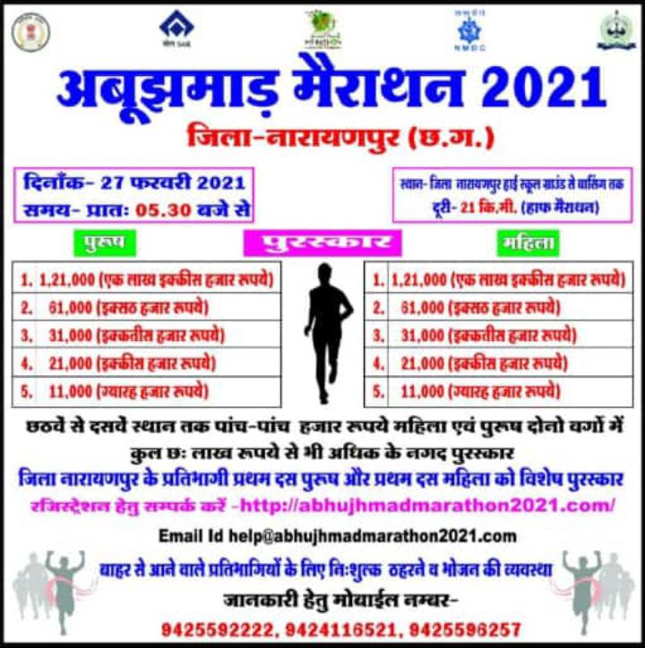 नारायणपुर ।अबूझमाड़ महोत्सव- तृतीय अंतर्राष्ट्रीय मैराथन 2021, 27 फरवरी 2021 को जिला मुख्यालय, नारायणपुर में आयोजित होगी, यह मैराथन अबूझमाड़ में शांति स्थापित करने के उद्देश्य से आयोजित की जाती है। जो इस वर्ष हाई स्कूल मैदान, नारायणपुर से बासिंग तक 21 किलोमीटर (हाफ मैराथन) का आयोजन किया जा रहा है। यह स्थान प्राकृतिक सुंदरता, वन, झरना और विशालकाय पर्वत श्रृंखलाओं से ओतप्रोत है।