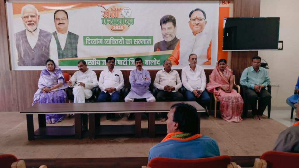 बालोद। भारतीय जनता पार्टी द्वारा चलाए जा रहे सेवा पखवाड़ा 2025 के अंतर्गत सोमवार को बालोद जिला भाजपा कार्यालय में दिव्यांगजनों के सम्मान समारोह का आयोजन किया गया। कार्यक्रम की शुरुआत मां भारती के तैलचित्र पर दीप प्रज्वलन के साथ की गई। जिले भर से आए दिव्यांगजनों का शाल व श्रीफल से सम्मान कर उनका मनोबल बढ़ाया गया। कार्यक्रम का संचालन भाजपा जिला महामंत्री राकेश “छोटू” यादव ने किया।
