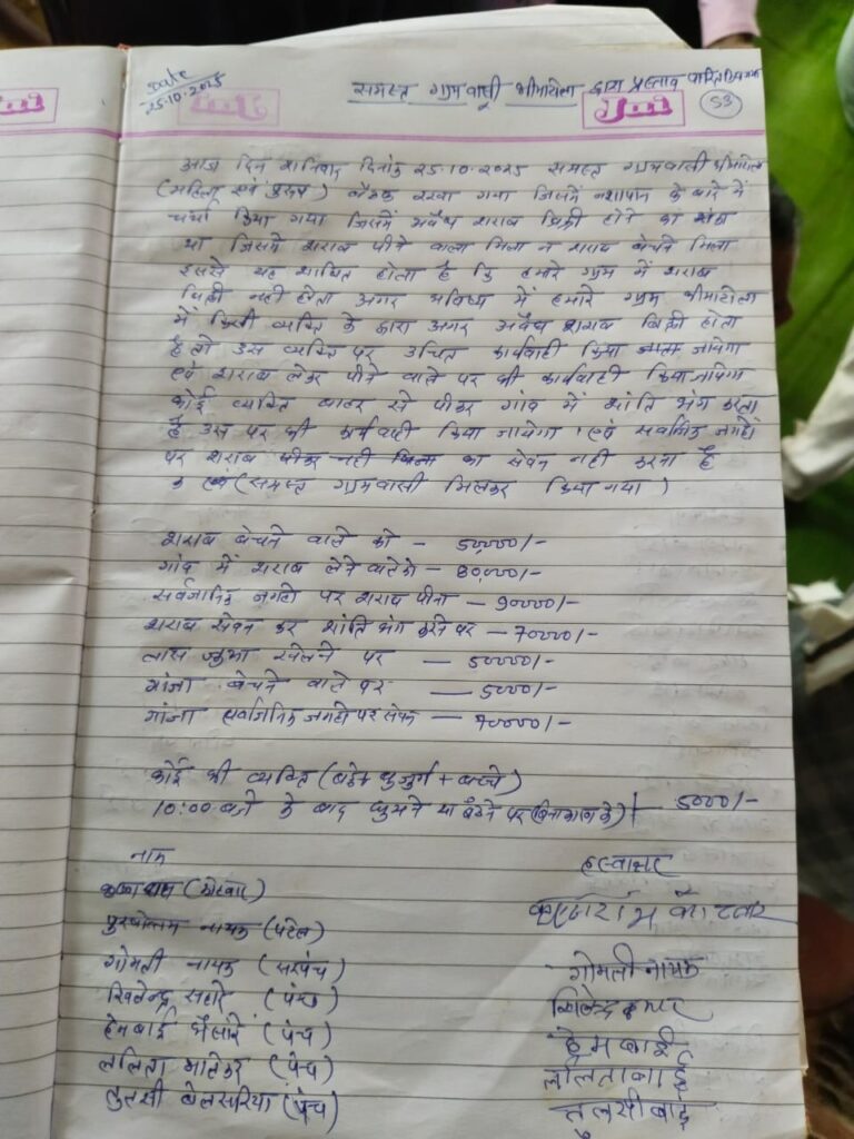 जिससे यह साबित होता है कि शराब को लेकर ग्रामीणों में आक्रोश का माहौल बना हुआ है। बता दे की ग्रामीणों ने बिना कारण के सार्वजनिक स्थानों में रात 10:00 बजे के बाद बैठने पर 5000 रूपये का जुर्माना भी प्रस्तावित किया है। साथ ही साथ ताश जुआ खेलने वाले व्यक्ति को पकड़ने पर 5000 रुपए का जुर्माना, गांजा बेचने वाले व्यक्ति को 5000 रूपये, सार्वजनिक जगह में गांजा, बीड़ी, सिगरेट, धूम्रपान सेवन करने वाले व्यक्ति को 70,000 रुपए जुर्माना लेने का निर्णय लिया गया है।