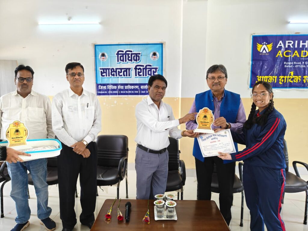 बालोद। बालोद शहर के एकमात्र CBSE स्कूल अरिहंत एकेडमी एवं बालोद शहर के लिए यह गर्व का पल है कि उसके विद्यार्थियों ने छत्तीसगढ़ राज्य विधिक सेवा प्राधिकरण द्वारा आयोजित राष्ट्रीय स्तर की चित्रकला प्रतियोगिता में उत्कृष्ट भागीदारी दर्ज की। इस भागीदारी के लिए संस्था को एक प्रमाण पत्र भी मिल गया है जिसे स्थानी जज द्वारा सौंपते हुए संबंधित बच्चों, स्टाफ और प्रबंधन को सम्मानित किया गया। सम्मान कार्यक्रम श्री श्यामलाल नवरत्न, प्रधान जिला एवं सत्र न्यायाधीश, बालोद, श्री संजय कुमार सोनी, न्यायिक मजिस्ट्रेट, बालोद और सुश्री भारती कुलदीप, सचिव, डीएसएल बालोद की विशेष उपस्थिति में हुआ।
