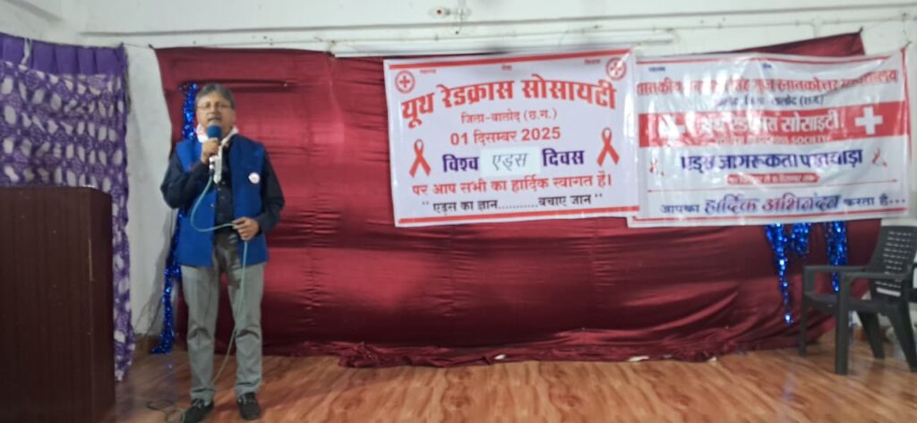 अध्यक्षता महाविद्यालय के प्राचार्य डॉ. जे.के. खलखो द्वारा की गई। कार्यक्रम में विशिष्ट अतिथि डॉ. एच.एल. मानकर वरिष्ठ प्राध्यापक महाविद्यालय बालोद, श्री रूपनारायण देशमुख कोषाध्यक्ष, श्रीमती कमला वर्मा वाइस चेयरमैन रेडक्रास जिला बालोद , सुश्री मधुमाला कौशल प्राचार्य सेजेस सिकोसा, सुश्री लिली पुष्पा एक्का रेड क्रॉस सदस्य जिला बालोद, एवं श्रीमती रीमा सोरी एवं जिला संगठक चन्द्रशेखर पवार उपस्थित रहे। कार्यक्रम का शुभारंभ मां सरस्वती के छायाचित्र पर दीप प्रज्वलन एवं माल्यार्पण से हुआ। मुख्य अतिथि तोमन साहू ने अपने संबोधन में कहा कि एड्स आज भी विश्व की गंभीर स्वास्थ्य समस्याओं में से एक है, परंतु जागरूकता, उचित जानकारी और सकारात्मक दृष्टिकोण के माध्यम से इसे रोका जा सकता है। उन्होंने युवाओं से अपील की कि वे समाज में फैली अफवाहों, भेदभाव और भ्रम को दूर करने में महत्वपूर्ण भूमिका निभाएँ। उन्होंने कहा कि एच आई वी से पीड़ित व्यक्ति हमारा शत्रु नहीं, बल्कि हमारी संवेदनशीलता और सहयोग का पात्र है। समाज में दया, प्रेम और जागरूकता का प्रसार ही एड्स के खिलाफ सबसे बड़ा हथियार है।” अध्यक्षता कर रहे अध्यक्ष डॉ. जे. के. खलखो ने युवाओं को संबोधित करते हुए कहा कि शिक्षित समाज ही संवेदनशील समाज बन सकता है, और इस प्रकार के प्रतियोगिता व कार्यक्रम युवाओं में जागरूकता लाने का सर्वोत्तम माध्यम हैं। उन्होंने कहा कि नशे से दूरी, सुरक्षित जीवनशैली और स्वस्थ आदतें एड्स रोकने में अत्यंत महत्वपूर्ण हैं। उन्होंने विद्यार्थियों को सामाजिक उत्तरदायित्व निभाने और वास्तविक जीवन में सीख को लागू करने का संदेश दिया।