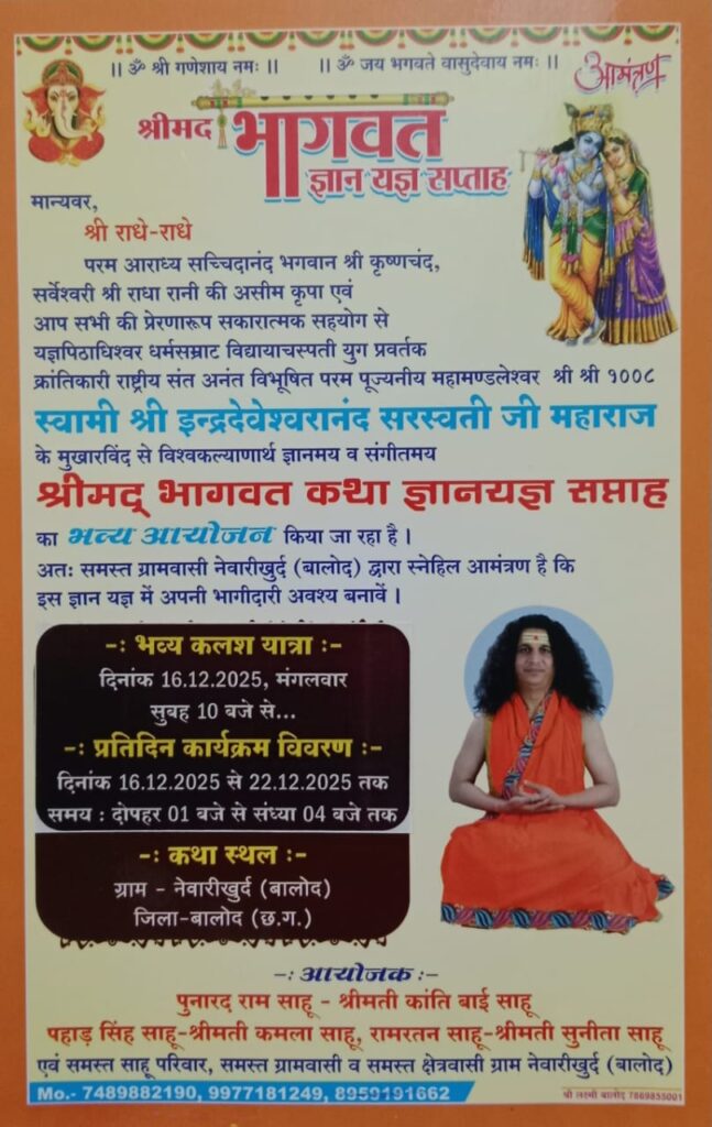 बालोद– जिले के नेवारीखुर्द गांव में 16 दिसंबर मंगलवार से 22 दिसंबर तक श्रीमद भागवत कथा ज्ञान यज्ञ सप्ताह का आयोजन होगा। स्वामी श्री इन्द्रदेवेश्वरानंद सरस्वती जी महाराज के मुखारविंद से कथा होगा। इसका शुभारंभ 16 दिसंबर मंगलवार को सुबह 10 बजे भव्य कलश यात्रा के साथ होगा। प्रतिदिन दोपहर 1 बजे से शाम 4 बजे तक स्वामी श्री इन्द्रदेवेश्वरानंद सरस्वती जी महाराज द्वारा कथा सुनाया जाएगा