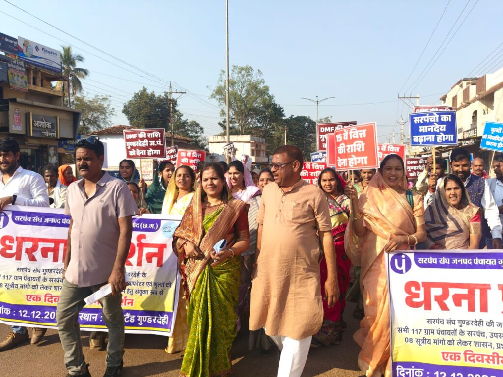सरपंचों ने धरना देते हुए मांग रखी कि ग्राम पंचायत में 15वीं वित्त की राशियां अतिशीघ्र दी जाए। डीएमएफ की राशि गुंडरदेही ब्लॉक अंतर्गत सभी ग्राम पंचायत को भी दिया जाए। सरपंच और पंचों का मानदेय सम्मानजनक हो। ग्राम पंचायत में ली जाने वाली संपत्ति कर एसडीएम गुंडरदेही राजस्व व कलेक्टर द्वारा आदेशित पत्र द्वारा मुनियादी करवा कर संपत्ति कर ली जाए। जनपद क्षेत्र अंतर्गत गांव में जल जीवन मिशन अति शीघ्र पूर्ण कराया जाए। ग्राम सभा के माध्यम से मुख्यमंत्री पेंशन योजना अंतर्गत 60 वर्ष के सभी बुजुर्गों को पेंशन की पात्रता मिले। साथ ही सभी विकलांग लोगों को भी पेंशन का लाभ मिल सके। ग्राम पंचायत के अंतर्गत कंप्यूटर ऑपरेटर और भृत्य को नियमित किया जाए। मनरेगा अंतर्गत निर्माण कार्यों की राशि का भुगतान अति शीघ्र किया जाए। इस दौरान प्रमुख रूप से लेख राम साहू अध्यक्ष, क्रांति भूषण साहू, दोशन साहू, डोमन देशमुख, कुमुदिनी साहू, प्रीति ग्वालियर ,सुनील बेलचंदन, काशीराम साहू, भेनू राम साहू, ओमीन साहू, जीतेश्वरी ठाकुर, जनपद सदस्य टूकश्वरी साहू, ललिता भूआर्य, रीना देशमुख, जिला पंचायत सदस्य मीना साहू, पूर्व जनपद अध्यक्ष सुचित्रा साहू सहित सभी पंचायत के पंच, उपसरपंच, पंचायत के भृत्य, कंप्यूटर ऑपरेटर उपस्थित थे।