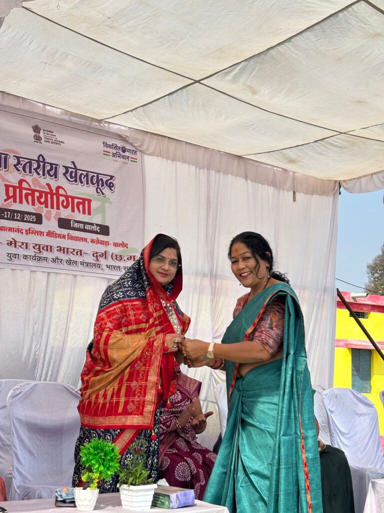 बालोद। बुधवार को विकसित भारत अभियान के अंतर्गत जिला स्तरीय खेलकूद प्रतियोगिता का आयोजन स्वामी आत्मानंद इंग्लिश मीडियम विद्यालय कन्नेवाड़ा बालोद में मेरा युवा भारत दुर्ग छत्तीसगढ़, युवा कार्यक्रम और खेल मंत्रालय भारत सरकार के द्वारा किया गया। इस कार्यक्रम में बालोद नगर पालिका परिषद की अध्यक्ष श्रीमती प्रतिभा संतोष चौधरी मुख्य अतिथि के रूप में सम्मिलित हुई। आत्मानंद स्कूल के शिक्षक- शिक्षिकाओं के द्वारा उनका गुलदस्ता भेंट कर स्वागत,अभिनंदन किया गया।कार्यक्रम का शुभारंभ सरस्वती माता के तैलचित्र पर पुष्प माल्य अर्पित कर दीप प्रज्वलित कर की गई। इसी तारतम्य में नपाध्यक्ष श्रीमती प्रतिभा संतोष चौधरी ने अपने उद्बोधन में खेल के महत्व के बारे में बताते हुए कहा कि खेलकूद हमारे जीवन का एक अभिन्न अंग है।