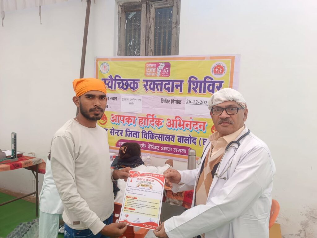 बालोद– वीर बाल दिवस के अवसर पर गुरूद्वारा गुरु सिंह सभा बालोद में रक्तदान शिविर आयोजित किया गया। जिसमें कुल 22 लोगो ने अपना रक्तदान महादान कर मानवता की मिसाल पेश किया। इस नेक कार्य पर जिला अस्पताल बालोद, ब्लड बैंक की टीम से डॉक्टर मुरली मोहन मूर्ति सर, उत्तम टंडन, रवि कुमार साहू, पोषण देशमुख, स्टाफ नर्स ऋतु साहू, हितेश्वरी साहू ने अपना योगदान दिया। जिसमें बालोद के समाज सेवी संस्था भगत सिंह रक्तवीर परिवार से प्रांशु कत्याल , दिलीप कौशिक इत्यादि लोगों का योगदान रहा।