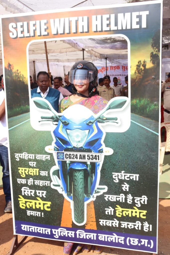 इस अवसर पर सड़क सुरक्षा मितानों को सड़क सुरक्षा बिल्ला वितरित कर लोगों में सड़क सुरक्षा नियमों का पालन करने के लिए प्रेरित किया गया। अतिथियों द्वारा सेल्फी विथ हेलमेट की थीम पर हेलमेट पहनकर सेल्फी लेकर लोगों को सड़क सुरक्षा नियमों के पालन करने का संदेश दिया गया। यातायात सड़क सुरक्षा माह 2026 के दौरान विविध कार्यक्रम जैसे स्कूली बच्चों का निबंध लेखन/चित्रकला/स्लोगन प्रतियोगिता, स्काउड गाईड के बच्चों के साथ गुलाब फुल भेंट कार्यक्रम, वाहन चालकों का स्वास्थ्य एवं नेत्र जांच, स्कूली बसों/एंबुलेंस का चेकिंग शिविर, लर्निंग लायसेंस शिविर, गुड सेमेरिटन्स का सम्मान जैसे कार्यक्रमों का आयोजन किया जाना है। इस अवसर पर श्रीमति मोनिका ठाकुर अतिरिक्त पुलिस अधीक्षक बालोद, श्री चंद्रकांत कौशिक अपर कलेक्टर, श्री अजय किशोर लकड़ा अपर कलेक्टर, शश्रीमति प्रतिभा चौधरी नगर पालिका अध्यक्ष बालोद, पदमश्री शमशाद बेगम (महिला कमांडो संरक्षक), श्री बोनीफॉस एक्का उप पुलिस अधीक्षक बालोद, श्री देवांश सिंह राठौर अनुविभागीय अधिकारी (पुलिस), श्रीमति चित्रा वर्मा नगर पुलिस अधीक्षक राजहरा, श्री नुतन कंवर एसडीएम बालोद, श्री चंद्रेश कुमार ठाकुर जनसंपर्क अधिकारी, श्रीमति रेवती वर्मा रक्षित निरीक्षक, श्री रविशंकर पाण्डेय प्रभारी यातायात, श्री शिशुपाल सिन्हा थाना प्रभारी बालोद, श्री दिनेश कुर्रे थाना प्रभारी अजाक, श्री मनीष शेण्डे थाना प्रभारी पुरूर, श्री धरम भुआर्य साइबर सेल प्रभारी बालोद एवं बालोद पुलिस के अधिकारी/कर्मचारी, बड़ी संख्या में महिला कमांडो, एनएसएस/एनसीसी के स्कूली छात्र एवं अन्य गण मान्य नागरिक उपस्थित रहें।