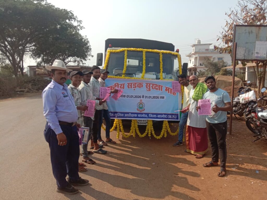 बालोद– जिले में ‘‘राष्ट्रीय सड़क सुरक्षा माह’’ का शुभारंभ कलेक्टर, पुलिस अधीक्षक एवं नगर पालिका अध्यक्ष बालोद द्वारा किया गया है। सड़क परिवहन एवं राजमार्ग मंत्रालय भारत शासन द्वारा जारी गाइडलाइन के अनुसार प्रत्येक जिला इकाई में दिनांक 01.01.2026 से 31.01.2026 तक यातायात सड़क सुरक्षा माह का आयोजन किया जाना है। सड़क सुरक्षा माह के प्रथम दिवस 01.01.2026 को कलेक्टर, पुलिस अधीक्षक एवं नगर पालिका अध्यक्ष बालोद द्वारा यातायात माह का शुभारंभ किया गया है, साथ ही यातायात जागरूकता रथ को हरी झण्डी दिखाकर रवाना किया गया। जिला पुलिस बल बालोद के अधिकारी/कर्मचारीयों द्वारा आम जनों को सड़क सुरक्षा नियमों के प्रति जागरूक करने के उद्देश्य से हेलमेट रैली निकालकर शहर भ्रमण किया गया है।