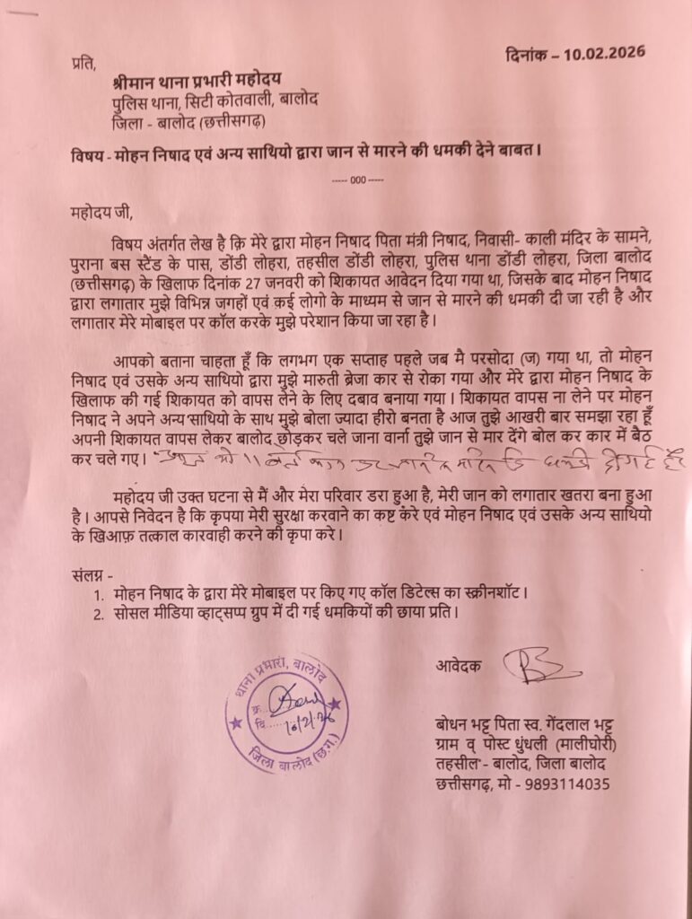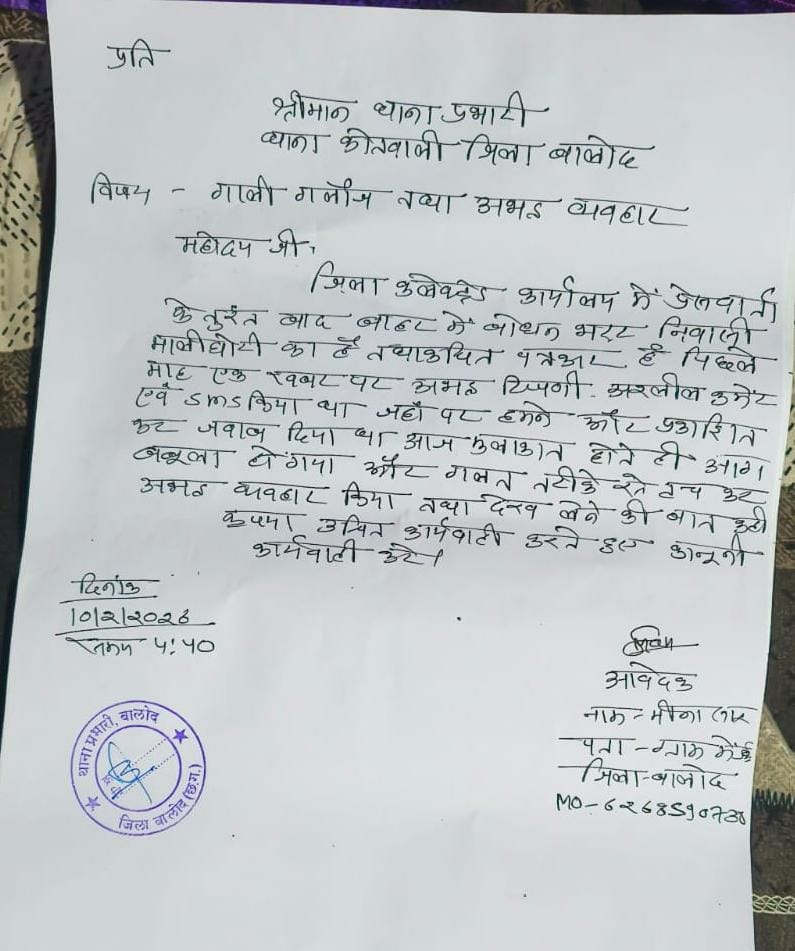 बालोद। संयुक्त जिला कार्यालय बालोद परिसर में आयोजित प्रेस वार्ता के बाद पत्रकारों के बीच हुए विवाद ने गंभीर रूप ले लिया है। एक ओर पत्रकार बोधन भट्ट की शिकायत पर छह पत्रकारों के खिलाफ मारपीट व धमकी का मामला दर्ज किया गया है, वहीं दूसरी ओर महिला पत्रकार मीनू साहू ने भी बोधन भट्ट के खिलाफ अभद्र व्यवहार और दुर्व्यवहार के आरोप लगाते हुए थाना प्रभारी को आवेदन दिया है। दोनों पक्षों द्वारा एक-दूसरे पर लगाए गए आरोपों के चलते मामला चर्चा का विषय बना हुआ है। इस घटना को बुद्धिजीवी वर्ग शर्मनाक भी बता रहे हैं। घटना का वीडियो भी सामने आया है,जिससे पत्रकारों की यह हरकत जिले भर में चर्चा और हड़कंप की स्थिति भी बनी है। प्राप्त जानकारी के अनुसार ग्राम मालीघोरी दुधली निवासी एवं स्वदेश 27X7 न्यूज चैनल के जिला ब्यूरो चीफ बोधन भट्ट ने बालोद पुलिस थाने में रिपोर्ट दर्ज कराई है कि 10 फरवरी 2026 को वे कलेक्टर कार्यालय में आयोजित प्रेस वार्ता में शामिल होने पहुंचे थे। प्रेस वार्ता समाप्त होने के बाद शाम लगभग 4:15 बजे वे अपने बैग एवं कैमरा स्टीक को वाहन में रखने जा रहे थे। इसी दौरान परिसर में मौजूद खिलावन चंद्राकर, मीनू साहू, तरुण नाथ योगी, यशवंत निषाद, मोहन निषाद और संजय सोनी सहित अन्य लोगों ने कथित रूप से गाली-गलौज करते हुए जान से मारने की धमकी दी और हाथ-मुक्कों से मारपीट की। रिपोर्ट में आरोप है कि कैमरा स्टीक छीनकर मारपीट की गई, जिससे उन्हें नाक, सिर, पीठ, सीना और हाथ में चोटें आईं। पुलिस ने भारतीय न्याय संहिता (BNS) 2023 की धारा 191(2), 296, 115(2) और 351(3) के तहत मामला दर्ज किया है।बोधन का आरोप है कि सभी आरोपियों ने एकराय होकर मुझे तु बड़ा पत्रकार बनता है व्हाट्सअप ग्रुप में तु हमारे खिलाफ लिखने का बहुत शौंक है कहकर मुझे आज तुम्हारी सारी पत्रकारिता को घुसाड़ देते है कहते हुये अश्लील गाली-गलौज कर जान से मारने की धमकी दी। इस घटना से उनके नाक, सिर, पीठ, सीना, बाएं हाथ का भुजा, बाएं हाथ के अंगुठा में चोट लगा है। घटना को मौके पर उपस्थित अन्य पत्रकार देखे सुने एवं बीच बचाव किए।