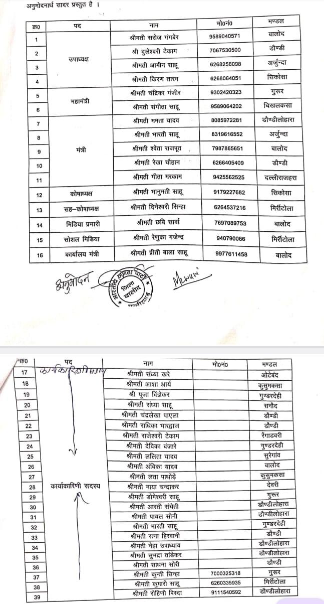 बालोद। भारतीय जनता पार्टी महिला मोर्चा जिला बालोद की नई जिला कार्यकारिणी की घोषणा कर दी गई है। प्रदेश नेतृत्व के मार्गदर्शन और जिला संगठन की अनुशंसा पर महिला मोर्चा अध्यक्ष द्वारा नई टीम का गठन किया गया है।