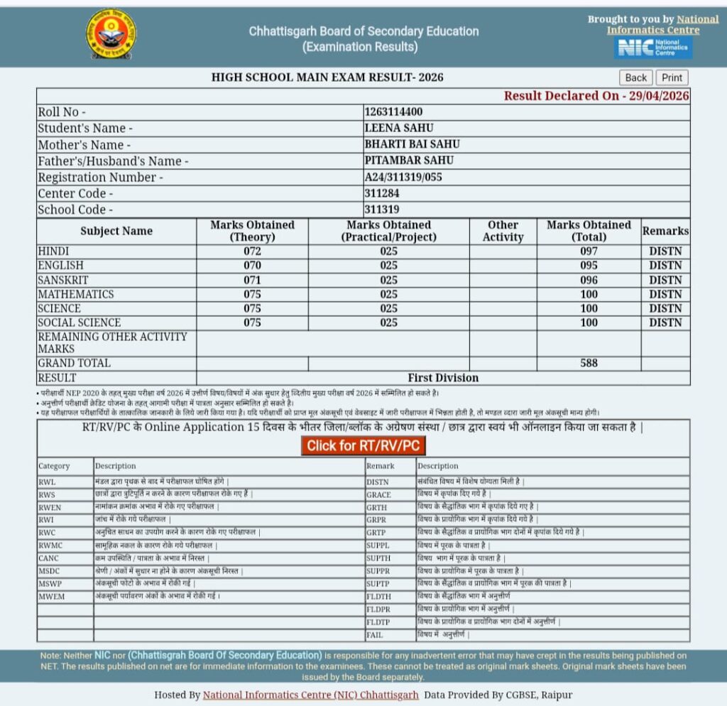 लीना साहू की यह सफलता न केवल उनके परिवार बल्कि पूरे बालोद जिले के लिए गर्व की बात है। सीमित संसाधनों के बावजूद उनकी मेहनत और लगन ने यह साबित कर दिया कि सफलता के लिए परिस्थितियां नहीं, हौसला बड़ा होना चाहिए, बता दे की अभी तक के जानकारी अनुसार बालोद जिले से इस बार टॉप टेन में कोई नहीं आए हैं। ये बेटी बिलासपुर में रहकर पढ़ाई कर रही थी।