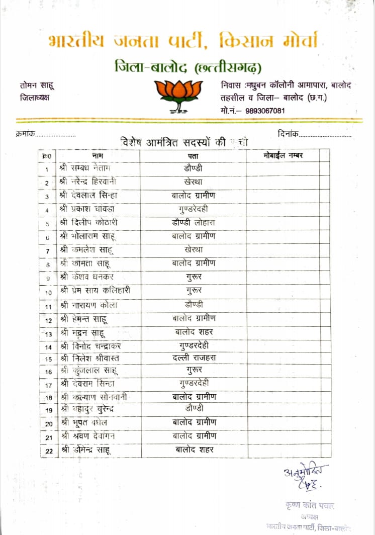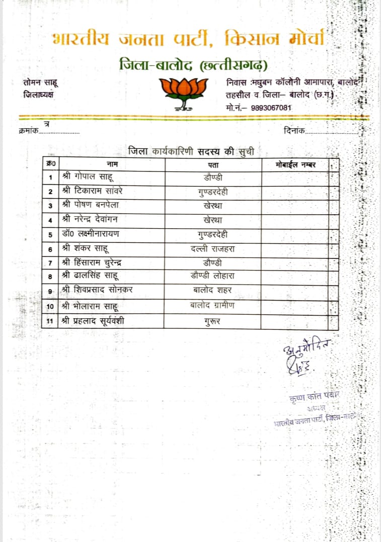 भाजपा किसान मोर्चा के जिला अध्यक्ष तोमन साहू ने कहा कि उन्होंने अपनी कार्यकारिणी में इस बार वरिष्ठ भाजपाइयों के अलावा युवाओं को भी प्रतिनिधित्व दिया है। बुजुर्ग व युवाओं दोनों के बीच सामंजस्य बनाते हुए सभी क्षेत्र में दोनों की भागीदारी रहने के लिए उन्हें अलग-अलग पद दिया गया है। देखें पूरी लिस्ट,,,,,