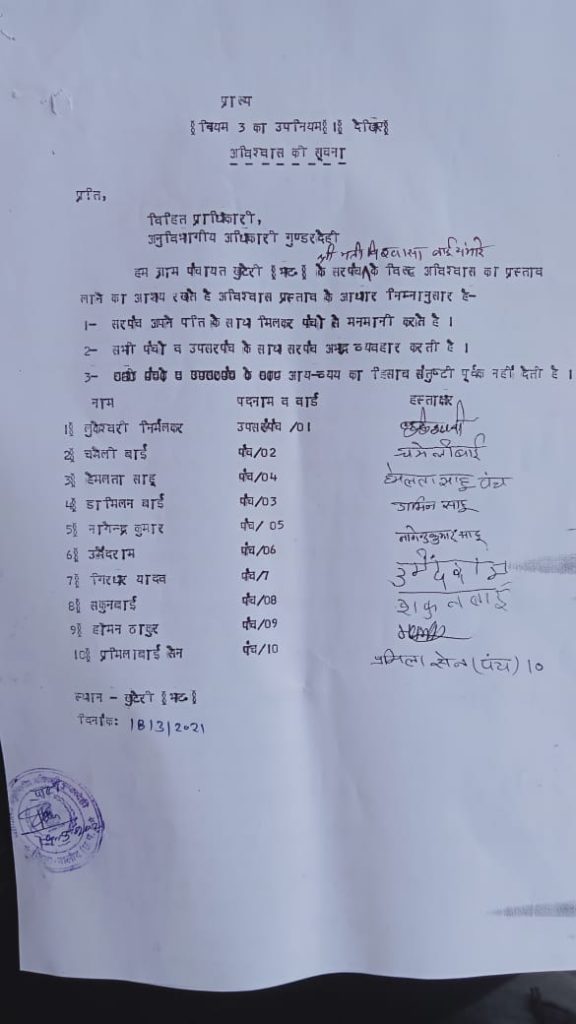 जिसमें सरपंच अपने पति के साथ मिलकर पंचो से मनमानी करना , सभी पंचो व उप सरपंच के साथ अभद्र व्यवहार करना व संरपंच द्वारा आय व्यय का सही हिसाब नही देना है। इन बिंदु को लेकर सरपंच के खिलाफ अविश्वास प्रस्ताव लाने ज्ञापन दिया गया है । अविश्वास प्रस्ताव लाने लुकेश्वरी साहू उप संरपच , पंच चमेली बाई डामिन बाई हेमलता साहू नागेन्द्र साहू उमेंद साहू गिरवर पटेल शकुन बाई होमन ठाकुर प्रमिला बाई ने हस्ताक्षर किया है ।