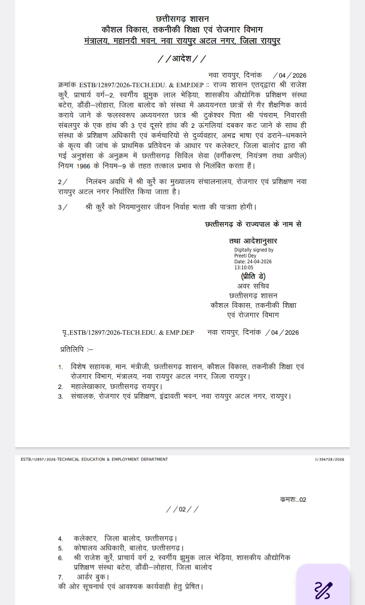 बालोद, 24 अप्रैल 2026। शासकीय औद्योगिक प्रशिक्षण संस्था (ITI) बटेरा में छात्रों से गैर शैक्षणिक कार्य कराए जाने के गंभीर मामले में बड़ा प्रशासनिक एक्शन लिया गया है। तकनीकी शिक्षा…