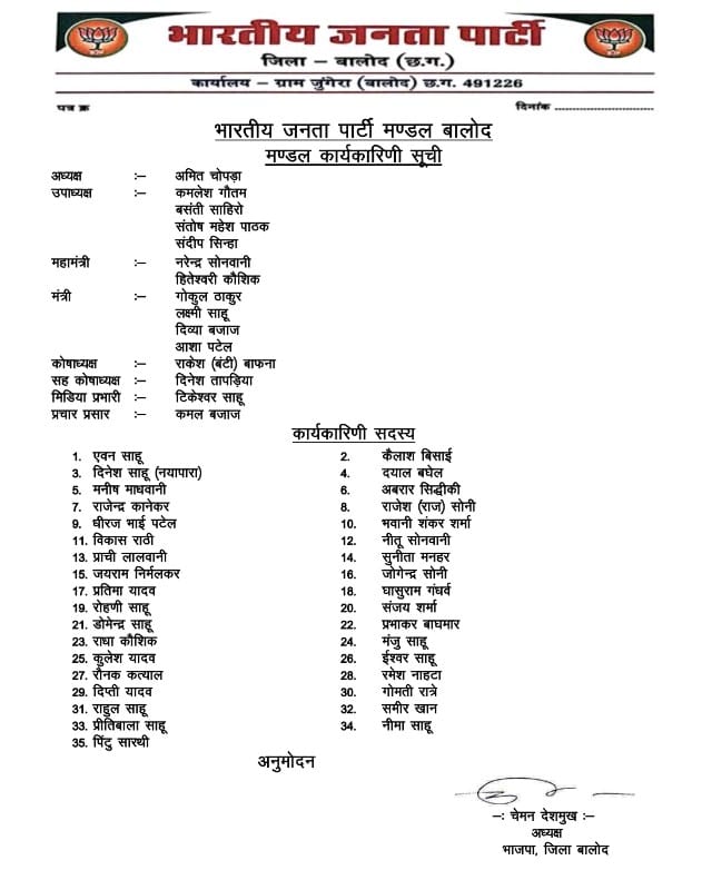 भारतीय जनता पार्टी शहर मंडल बालोद का हुआ नवीन गठन